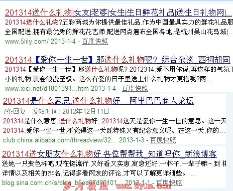 这些也是最近所发布的,而看这些的快照,你会更加的惊讶,因为快照一般都是1月4号(最近的内页快照一般都是收录时候的时间),说明了在1月4号的时候发布了大量的关于201314的礼物之类的话题,也说明了,这种营销模式的可行性,即博客,论坛的发布和推荐,从而扩大营销的范围。