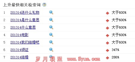 总结以上的触发点,你可以分析出更多的信息了哦,比如说“201314礼物”,“201314 短信”,“201314 留言”等等可以发挥的地方,甚至于还有“201314 结婚”对于婚庆行业来说也是很好的主题切入点哦。