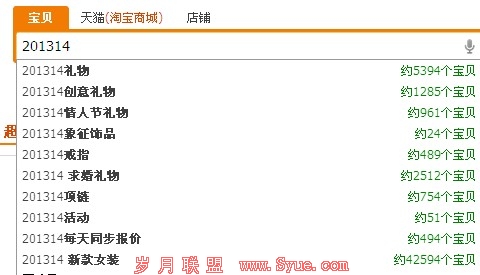 在百度之中,“201314送什么礼物”系列的话题上升的最快,自然也是一个主题了,关于其他“201314 领证 结婚”等等的话题也是可以切入考虑的,这仅仅是百度中的201314,自然我们还有其他的途径来找寻自己的发挥空间。如图是淘宝上的201314(连淘宝上也有,可见火爆程度)