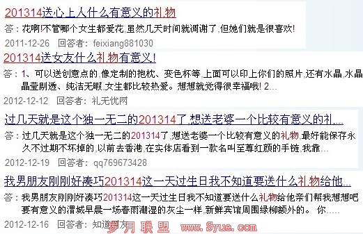 其实有很多朋友都在最大的问答频道中寻找自己的答案,提问201314应该送什么东西好,而且一般而言多是在2012年12月底的时候,因为那个时候想要开始买东西了嘛,这个也是一个营销的黄金点,有时候礼物这种东西,问永远都是在前面。这是百度知道,在百度知道,我们也可以看到很多的营销啊,比如说上图圈住的地方,就是一些特意所做的,我相信这些都是特意所做的推广营销,在无法留下外链的时候,留下自己的品牌名称也未尝不是一种好的方法。而在其他方式中,如图