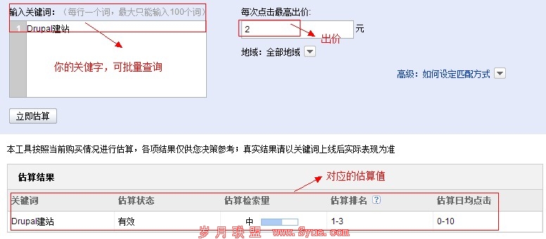 第四步:用估算工具查询不同的关健字、不同出价对应的排名及流量,拿“Drupal建站”为例: