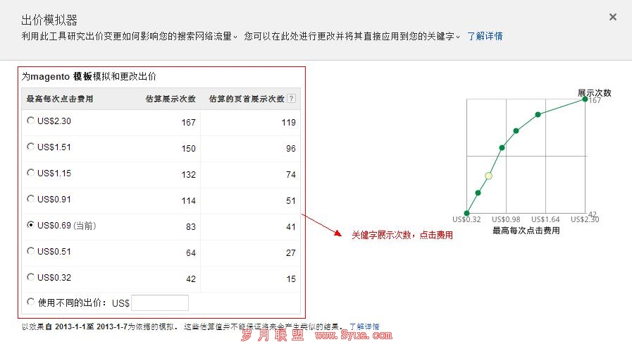 最后,希望百度在调价功能上也能像谷歌一样,对每个关健字的价格趋势,流量趋势给予更合理的建议,每调一个关健字,要运用两款工具是非常复杂和繁琐的。下面是谷歌在调价方面的功能介绍!
