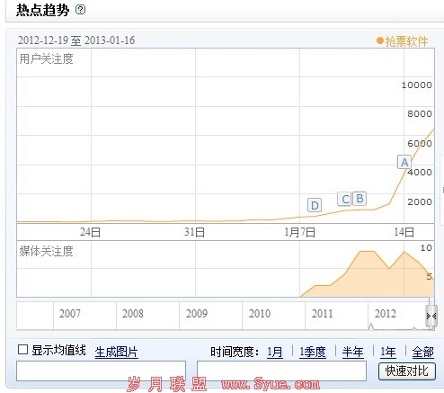 元创就简单介绍这么几种常见方法,我们再看抢票插件相关百度指数,从1月初开始,抢票软件百度指数就开始飙升,近几天达到高峰,是2012年同期的10倍以上。