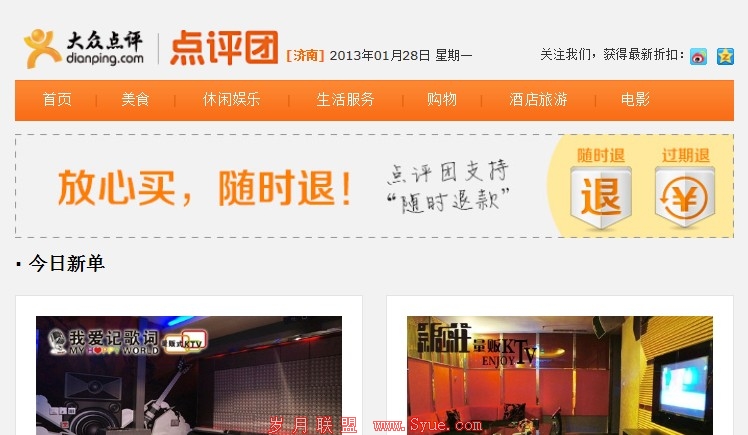 这是大众点评网的一则推广邮件,作为一个生活服务类网站,它本身就能引来足够的关注,因此在点击率上必然有保证。而大众点评网在风格上明显与智联招聘不一样,内容多了很多,而且图片设计上也追求一板一眼,细心地朋友会发现它的邮件像正常网站一样分了标题,可以满足不同需求的点击者。此外,作为邮件阅读几率最大的上部,大众点评明确指出“支持随时退款”,无疑一句话说到了大家的心坎中。虽然内容相对于智联招聘很多,但是多而不杂,其实很有用。
