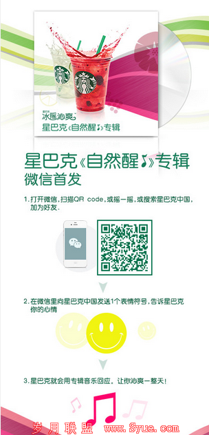 微信无疑是今年最火的移动社交应用,星巴克一直走在科技与时尚的前沿,自然要在微信这个新兴平台中进行尝试。今年9月,星巴克在其微信中推出“自然醒”活动:在微信中加“星巴克中国”为好友,只需发送一个表情符号,星巴克将即时回复你的心情,即刻享有星巴克《自然醒》音乐专辑,获得专为您心情调配的曲目,感受自然醒的超能力,和星巴克一同点燃生活的热情和灵感。这种创新式的互动推广获得了消费者的喜爱。之后星巴克又推出“星巴克闹钟”活动,以配合早餐系列新品上市。下载星巴克APP,按下闹钟后一小时内到达星巴克门店,即可在正价购买饮料的同时,享受早餐食品半价的优惠。一经推出,便受到了广大星巴克粉丝和手机用户的青睐,在微博上被大力推荐和分享。