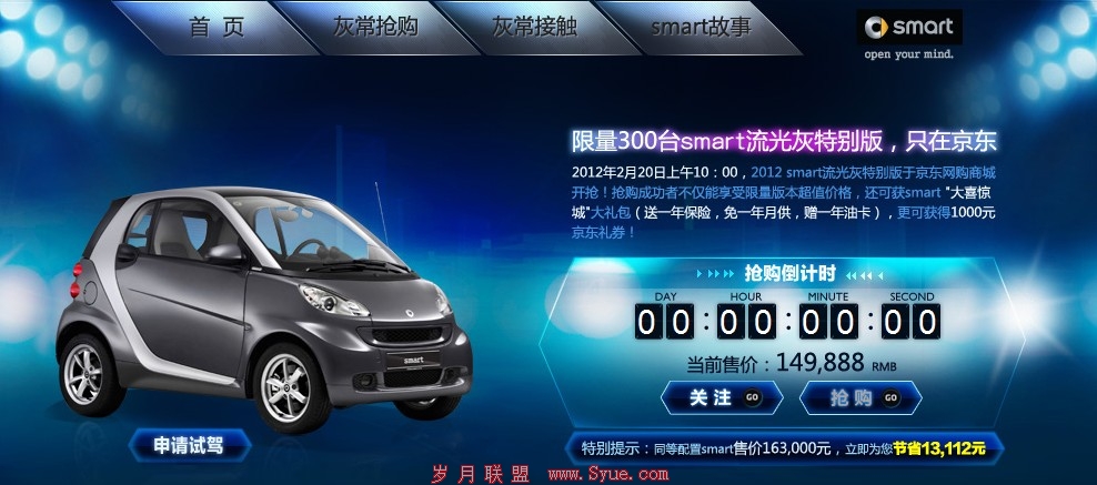 奔驰选择京东作为Smart限量版网上销售的阵地。2月10日至19日,首先是电视户外网络预热,结合微博为活动造势。随后,Smart在5个重要销售城市的影院展出,同一时期,Smart在中国当红的娱乐节目“非诚勿扰”中露出。2月20日,Smart正式销售时,奔驰采取了每推迟1小时购买价格增长36元,预售阶段购买还会额外奖励1000元京东抵用券的营销策略。300辆smart在89分钟内销售一空,相当于每半分钟销售一台。同时,整个推广活动还搜集到数以千万的销售线索。