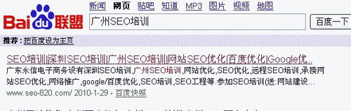 做网站优化做了六个年头了,还真就发现有很多做网站优化的人还真是不要脸,哎,现在中国的SEO市场确实是鱼目混珠啊,让很多的客户不知道怎样去选择,不知道哪家是正规的,哪家是违规操作,当然只有上一次当你才会学一次乖,没办法,不入虎穴焉得虎子啊!现在我就讲一下今天刚看见的实例,本站:http://www.seo-820.com 关键词:深圳SEO培训(百度第四位)广州SEO培训(百度第一),长期排名稳定,网站建设到现在不到3个月(以前的老站被PASS掉了),可以说是相当好的了!今天在百度搜索"广州SEO培训"当然还是排名第一了!哈哈!我就发现一个问题就是百度下面的相关搜索栏里面。全是某公司的名字,真是为了达到目的是不择手段啊!如图: