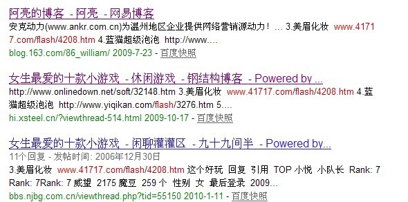 而且这些广告(女生最爱的十款小游戏)都是最近的,姑且认为发广告的仁兄是随意通过这个网站编造的一个游戏网址吧。但是五种生有的页面也能被搜索引擎收录,可见反向链接的重要性了,所以站长朋友在推广的过程中,始终要把建设反向链接放在重要的位置。