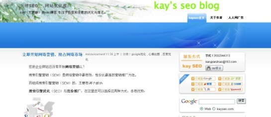 kay's seo blog的博客非常简洁,里面重点介绍谷歌优化和百度优化的一些技巧,实用性很强,作者观点很独特,值得一看。