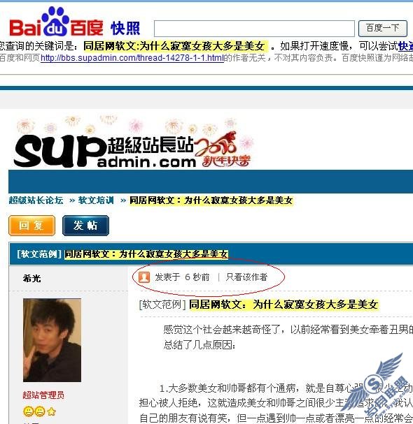 上面讲的是一些基本的因素,这些基本因素,可能有的站并不好,但是权重却很高,基本因素,只是让我们对网站做个初步的了解和判断,但是实战测试却十分的一针见血,如果你的文章一发布到网站上,很快就被搜索引擎收录了,那么你觉得这个网站速度快不快,如果你进行跟踪你的网站新内容的收录速度,并且逐渐记录下来,相信你会对你的网站的权重有个十分直观的了解,那我们怎样去测试呢,这里把昨天超站论坛的一个测试结果和大家分享一下,昨天一篇标题为“同居网软文:为什么寂寞女孩大多是美女”帖子,发布之后一段时间,在百度搜索“同居网软文:为什么寂寞女孩大多是美女”,如果搜索到了你网站的结果,然后点击百度快照,去查看:超站这篇帖子的查看结果如图