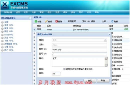 2.首页域名最后是否带有index.html这样一个尾巴,一般我们从用户体验及搜索优化上来说,不带index.html的短域名会更好。这个可以在”cms后台管理-系统管理-URL设置及重写”里把index项重写启用就可以了(一般系统默认是启用的)