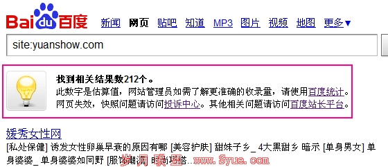 今天周五是百度例行更新的日子,英文SEO通过site语法查看网站收录,很遗憾今天百度并没有更新,不过英文SEO发现site网址的搜索结果进行了局部改版,在搜索结果的最上方,不但用粗体字显示了网站的收录情况,还增加了一个小提示: