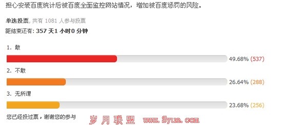 从这份调查显示:49.68%的站长表示敢安装百度统计,26.64%的站长不敢,剩下23.68%的站长表示无所谓。