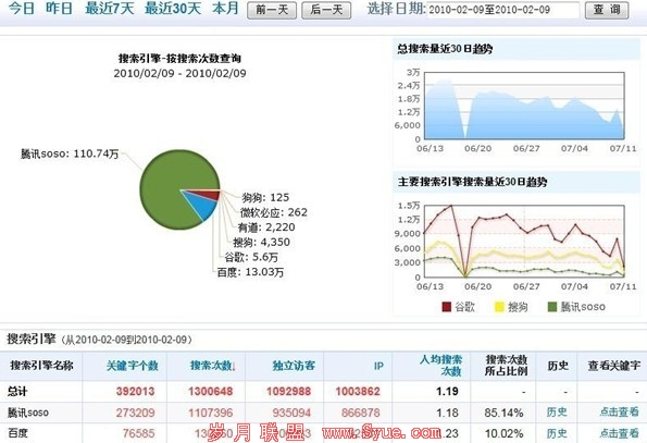 2009年9月3日,腾讯SOSO宣布正式采用独立搜索技术。此后SOSO给我的流量也越来越高,每月差不多翻倍。到了12月时已接近四五十万IP。应该说2009年11月到2010年5月这半年时间才是这个网站真正的收获期,当时不管是弹窗、GOOGLE还是其他SP收入都相当的爽。2010年2月9日那天晚上,我还拉了几个特别好的朋友加进一个群里面,见证网站IP突破百万。98万时就隔段时间就刷统计页面,一直看着它到100万。那时确实很激动,一个个人站居然可以做成这样。