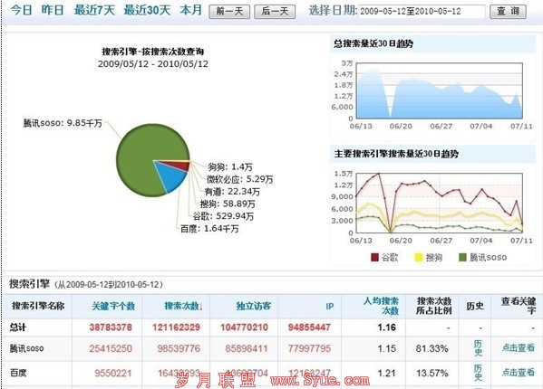 当时注册这个域名很偶然,因为我正好拿到一个天气预报的程序,小偷程序。整站源码打包后不到2M。但就是这样一个小偷程序却在后来为我带来了房子、车子。我从流量统计中截取了较高流量的一个时间段:2009年5月12日到2010年5月12日,这一年时间累计从搜索引擎带来流量9500万IP,日均30万IP。如下图: