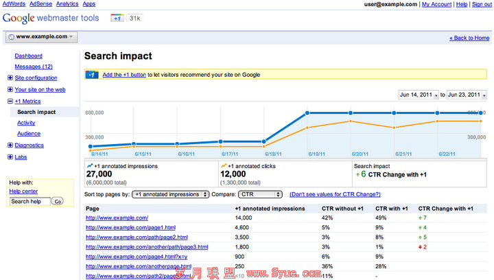 首先,谷歌网站站长工具中的+1指标将向您展示+1按钮如何影响着您网页今后的流量: