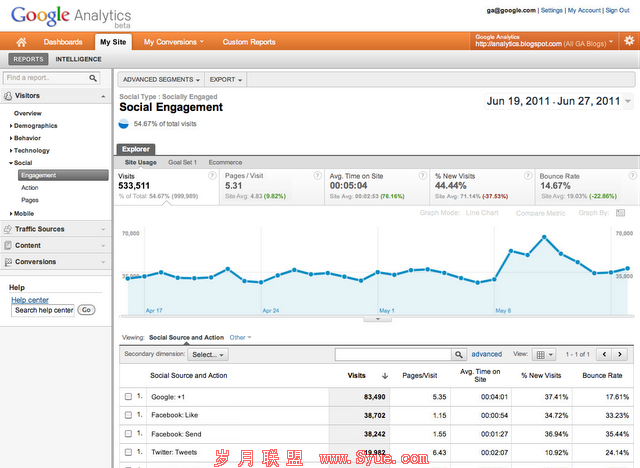 最后,通过Google Analytics中的社交插件跟踪功能,您还可以看到,用户是如何使用除+1之外的其他按钮来共享您的内容的。一旦您为Analytics配置了JavaScript,社交参与报告会帮您比较在您的网页上发生的各种类型的共享活动。