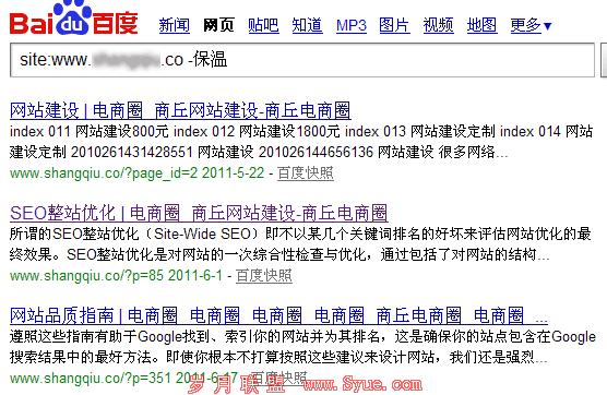 哇,是不是很多新手站长都动心了?其实静下心来自己先分析下便会发现此站也并不是你想象中的那么好,笔者此时到百度里查看了下,输入:site:你的域名 -保温,如下图所示。这里的“-保温”知道什么意思吧,就是这个网站除了关键词保温以外,其他被收录的页面。发现什么了?没错,这个域名之前是做网站建设、网站优化、网站推广相关关键词的网站,而现在只是拿以前的域名解析现在的新网站上来啦。这下恍然大悟了吧,呵呵