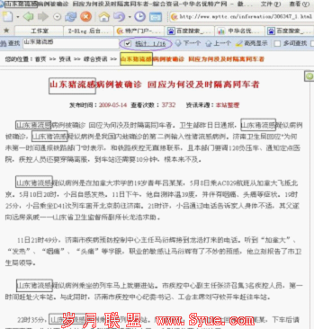 这是一家农业特产类信息网站的某一内页,在猪流感期间,利用文章内页来优化“山东猪流感”这个关键字,虽然网站本身权重还是很高的,但是内页的优化上,还是从关键字的密度方面着手,首先是TITLE(这里既文章标题)中,“山东猪流感病例被确诊,回应为何没及时隔离同车者”,里面包含了关键字“山东猪流感”,标题采用了<h1>标签,另外在正文内容中进行分布,第一段稍微多一些,分布了三个关键字,第二段一个。总体来说均匀,并且稍微的分布,更重要的一个是自然。自然不仅对于搜索引擎来说重要,对于用户来说更重要。