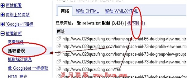 这点对google网站管理员工具来说其作用和测试相应链接屏蔽是否起作用是一环接一环的,当我们对网站错误链接进行测试后就要通过故障诊断的抓取错误所展示的结果分析所测试的结果是否正确,当我们发现故障诊断的抓取错误呈现找不到的链接后就要通过网站配置的抓取工具权限进行测试性屏蔽。如下图: