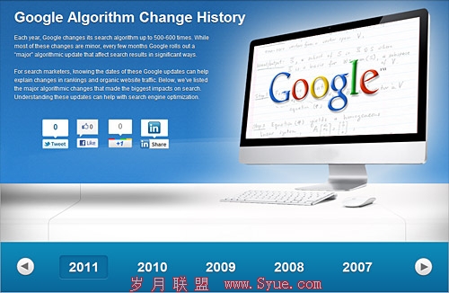 近日Seomoz发布了一则新的专题,有关Google算法变迁的。从2000年到2011年每一次升级都做了详细的列举,具体如下: