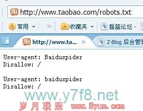 我们看到百度确实收录了淘宝,收录总量达到28万多(收录的多是二级域名的网店),而且快照都是最新的,不过让我很费解的是,当我查看淘宝的robots.txt文件时,依旧是对百度蜘蛛是禁止状态,如图: