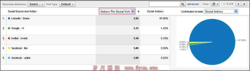 如果您单击“操作”选项卡下拉列表,并选择每个社会访问的动作,你可以看到的平均数目由用户点击每个按钮所采取的行动。