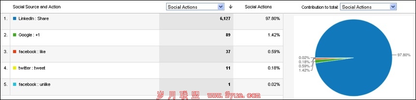 操作选项卡上列出了用户在指定的时间内参与社会活动的概述。它显示参加多通过的类型(例如Tweets,Google+1等)么种类型被采取了多少次,每个类型所占的百分比。在图中显示Google+在这段时间里分享按钮的使用超过喜欢和Tweets的总和。