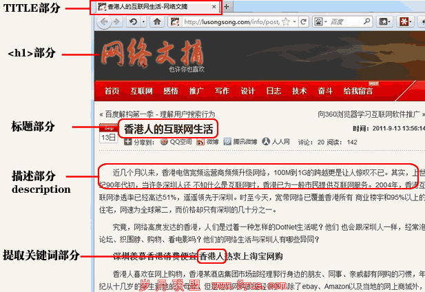 而第二行的描述部分通常会截取description部分,但更多时候会抓取正文的前200字,如果你要说具体显示description还是截取 正文,是和用户搜索的关键词有关。比如图一中,百度截取了<h1>中的关键词,因为卢松松博客的中有“互联网”这个关键词。下图能直观的反应 出这些问题。