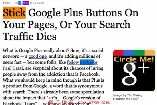 Google 在发布 Google +1按钮的时候称其不会影响到搜索结果,但最近福布斯发表的一篇文章却揭示了问题的另外一面,尽管这篇文章马上“被下线”,但它已经被 Raven Blog 捕捉到,你也可以通过 Blekko 搜索的 cache 看到原文。