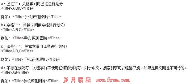 这几种形式的标题所表达的意义是相近的,即搜索引擎都能识别标题中包含以下关键字:”手机”、”评测”、”图片”、”手机评测”、”评测图片”及”手机图片”,但这四种表达方式所产生的效果却是不一样的,一般认为:”竖杠>空格>逗号>不存在分隔符”。