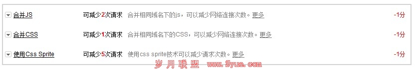 细致入微的百度没有像其他测速网站一样,仅仅给出页面下载总时间完事儿,而是在服务器速度一定的情况下,给出了提高页面加载速度的几种方案,其中主要有合并JS文件、合并CSS文件,使用Css Sprite以减少对服务器的请求次数等方法。 这些细节问题,很少有人注意到,因为提升的几毫秒速度几乎可以忽略不计,但有经验的前端工程师会考虑到这些问题,这样你的站点的速度拼不过几大门户,但是却获得了百度的不少加分。 类似的一些细节性可以提升页面速度的技巧还有很多,比如,启用gzip压缩页面体积(很多主机都拥有的功能,但是知道用的人很少),将JS文件放在页面的后面可以明显提升页面加载速度(这点多少人的站点做到了?),图片限定大小可以避免浏览器重新渲染等。