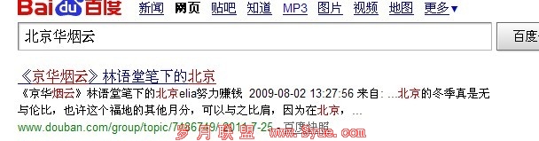 而有一种特殊的情况,就是关健词前后组合内容被认为粘性相差不大,而搜索结果辊也同时包含这两组词的话,百度会进行正反向同时进行分词匹配,如搜索关健词:北京华烟云,返回结果如下: