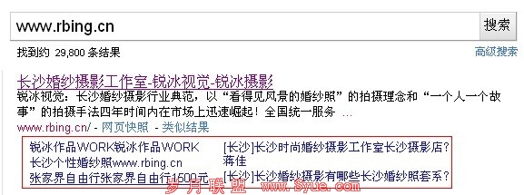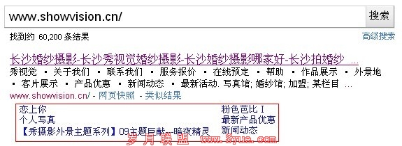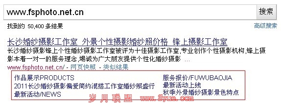 除了赚钱外,企业网站也有权重很高的,很多seoer在交换链接时就会遇到这样的问题,当自己的网站是一个大型的门户站,而对方是一个数据小的企业站,收录看上去才几百篇,想来想去还是决定不能跟对方交换,原因就是它的收录太少了,其实个人认为收录跟网站权重并没有多大的关系,试想想现在很多电影站、小说站采集可以达到上百万的收录,但是网站整体权重却不怎么样,我们千万可别小看企业网站,权重高的,它也有Goole Sitelinks的,举个比较热门的行业:“长沙婚纱摄影”的案例: