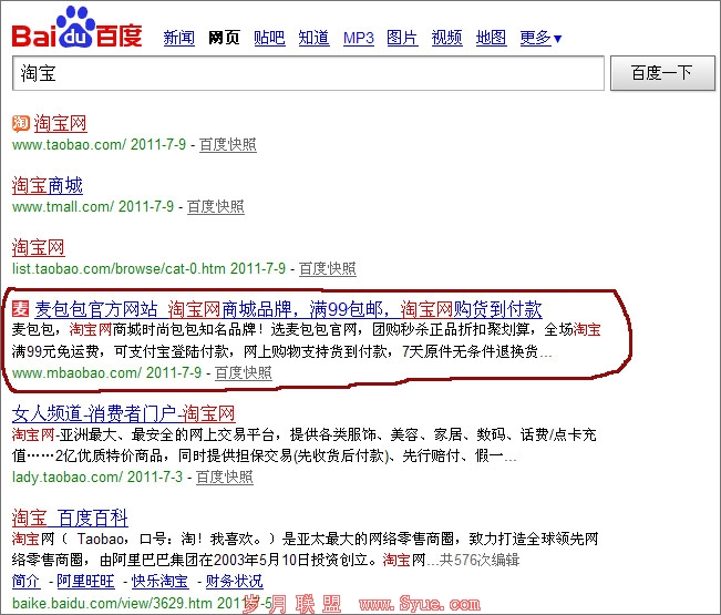1. 淘宝以及淘宝网等系列关键词,每天的搜索量都是天文数字,一般人几乎不敢往这方面想,但麦包包不但想了,而且还做到了。