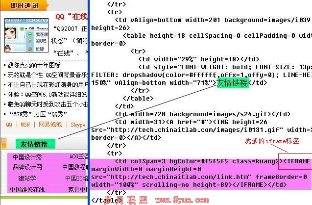 Iframe框架的用途想必很多站长都知道,我们一般利用iframe框架来放广告,因为作为广告,他不需要传递权重,不肖的站长就学会利用这项功能,他们会将你的友链置于iframe框架中,这样即使你在首页看到,在代码中看到你的友链,但是对你的站点一定作用都没有。针对这种欺骗,我们只能细细的查看源代码,一般如果使用这种框架我们可以在友链的上方找到(如下图所示),以使用工具检测的。