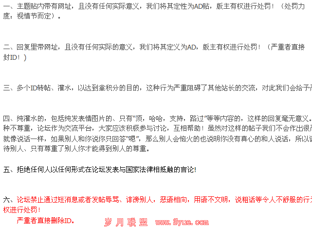 如果你开始就了解论坛上的版规,那么对于利用论坛推广肯定是想越快越好,而且过程中也会带有一些论坛所禁止的信息,毕竟要有吸引力,自然就会使用一些相当敏感的词了。这样就很多容易导致自己还没推广起来就被封号了。而且论坛对于广告每个都是要求很严格的,一般情况下论坛可以忍受的广告都在三贴之内,独有的广告区就另讲了。所以,看清论坛的版规可以给自己的论坛推广增加一点可掌控的力度。