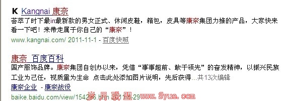 康奈、红蜻蜓相信大家都蛮熟悉的,大家可以到百度里搜索,康奈和红蜻蜓的官网都是排在百科前面的。这样的企业官网,没有做丝毫的优化,也没有强大的外链,但已经排在百科的前面了。但这一条是很难做到的,本人说的是一个方式。希望大家勿拍砖。下面是它们排名的截图。