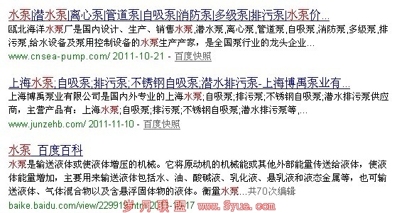 很多人都不能确定一个老域名是否能带来相当的权重,个人认为,老域名是非常受百度重视的。下面是一个水泵,百度指数上千的词,有一个站点既没有庞大的外链,也没有看到多少原创文章,并且快照都还不是隔日的。但它排在了百度百科水泵做个词的前面。