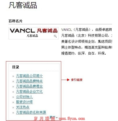 索引链接通常加在文章正文前列,将文章的主体内容罗列出来设置成索引,点击即可跳转到文章的相应段落。索引链接最有代表性的应用是百度百科。