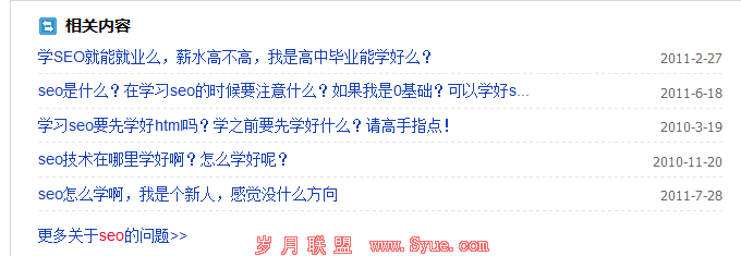 也就是相关内容,相关内容越多,越有利于排名,因为这相当于百度知道内的“内链”,也相当于所提问题的“外链”,当别人看到时候,很有可能看到显示在相关内容的问题,结果自然有利于提升排名。