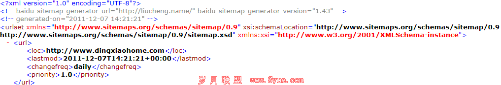 网站地图的另一种表现形式就是XML形式的网站地图,英文是Sitemp---s需要大写。这种格式的网站地图一般网上都有自动生成的工具,只需要将你要生成的网站网址输入进去就可以自动生成了。以xml形式的网站地图是由XML标签组成的,网站地图实际上是列出需要被收录的页面的URL,如下图就是标准的形式