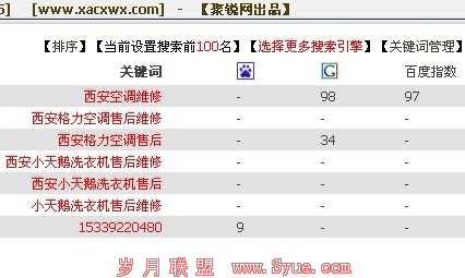 11月接一个外地单,新站,做家电维修类的网站优化;关键词如:西安空调维修、西安小天鹅洗衣机售后维修、西安格力空调售后维修等。除了西安空调维修有点指数外,其它都是没有指数,也没太大竟争。但是客人比较急,问一定要在网站建设后一二周内看到效果,问我能不能做。我肯定的说不能,但是尽量吧。最后客人还是相信了我,接下了这个优化单。
