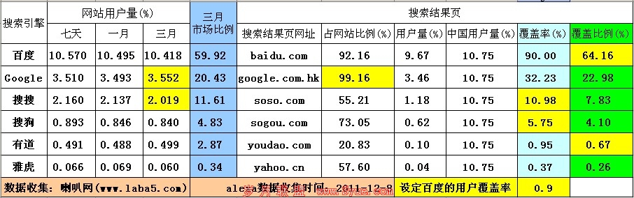 通过此表,看以看到如下状况(假设中国就这几个搜索引起,毕竟其他搜索引擎的市场占有率暂时还太少):