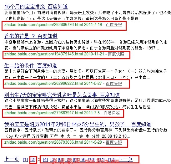 上图是我从问我原因的人中随便挑选出来的一个网站查询其百度相关域的结果,第三页的截图,可以这么说,除了第一页之外,其他所有的反链几乎都是百度知道带来的,我们知道,百度反链的准确叫法是百度相关域,而百度相关域的定义决定了,对方页面上必须留有网站的网址,或者切词网址得到的完整网址之后,在我们domain其网址的时候,才会出现在搜索结果中,而图中的百度知道外链,在我们打开后,几乎是找不到网址的,那为什么这些百度知道的页面会被统计到百度相关域的结果之中呢?