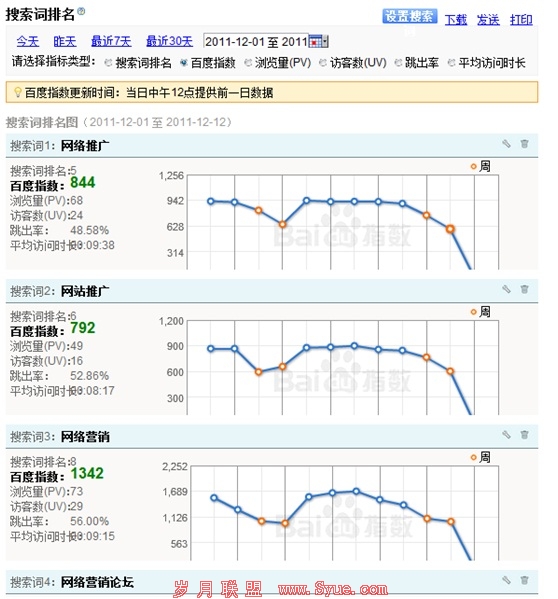 因为网站装了百度统计,因此还在左侧能了解到这些搜索词,每天过来的“访客数”、“浏览量”、“跳出率”、“平均访问时间”等等。平且也可以用曲线图的形式,把这些数据几天的变化情况展示出来,从而给站长更多的参考。