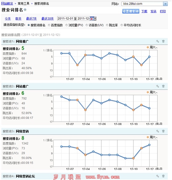 现在百度统计提供的权限是,可以最多同时关注10个搜索词的排名情况。这个观察数量应该已经能满足大部分网站的需求。比如28推来说,最关注的其实也就是“网络推广”、“网络营销”、“网站推广”这几个词的情况。通过上图能一目了然的知道,这3个词最近几天的排名情况,是上升还是下降。
