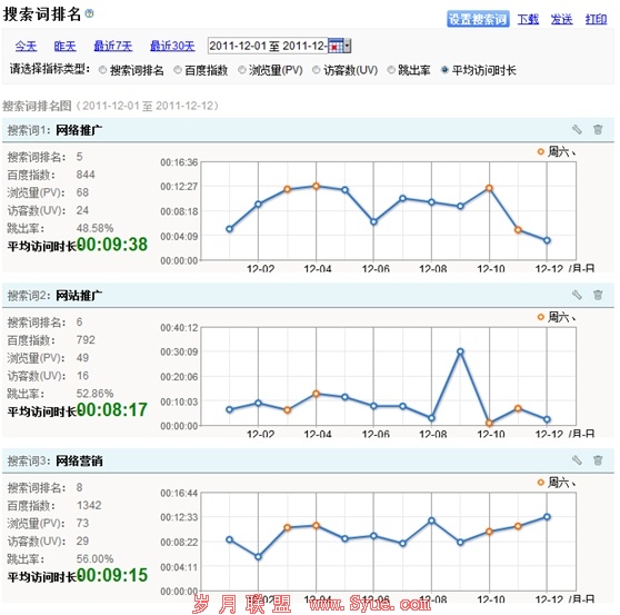 同时,还能显示访客产生的平均访问时长,可以分析通过哪个搜索词进来的用户转化率更高,从而随时对关键词优化策略进行调整。