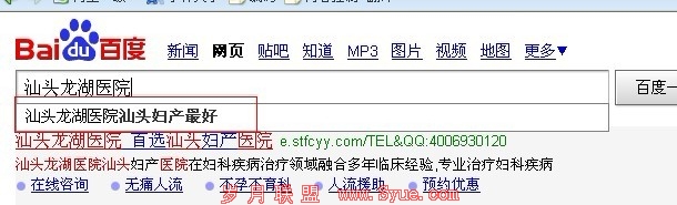 笔者搜索“汕头龙湖医院”就在百度下拉框上出现“汕头龙湖医院汕头妇产最好”,那么很明显这家医疗单位对百度的曝光率还有品牌推广是非常重视,但是里面缺乏的就是对于后期的维护引导。怎么来引导这个关键词的流量?请看下张图片: