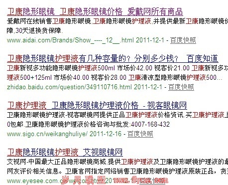 这个图,是搜索“卫康护理液”这个词得到的一个排名情况,第一个网站的TItle里面,并没有包含这个关键词,而是在描述当中有所出现,但它的排名却比一些标题当中含有该关键词的网站要好。这也就意味着在Meta标签当中做关键字堆砌现在依然还是存在一定的效果的。